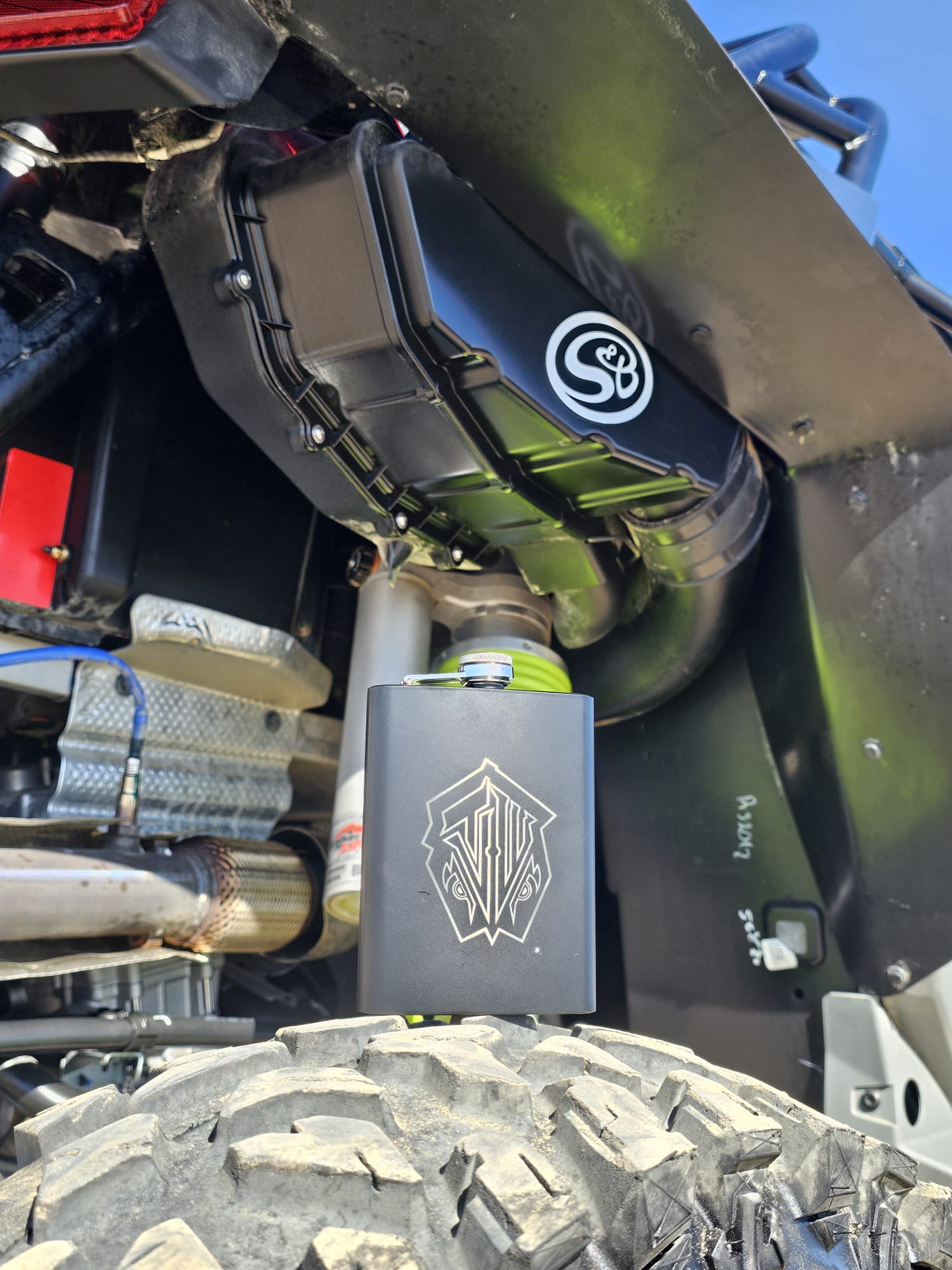 This black flask is sleek and stylish. It can be used for carrying small amounts of liquid, discreetly. Its matte or stainless finish gives it a sophisticated and modern appearance. This flask is made from stainless steel, ensuring durability and a clean, taste for its contents. It features a curved shape that fits comfortably in a pocket or hand. It also features a screw-on cap, to prevent leaks and a hinged arm to keep the cap attached when opened. The black exterior is laser engraved with the Twisted Vision Works logo, making it a popular choice for off-roading enthusiasts.